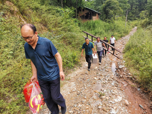 7月24日生態(tài)環(huán)境與地質(zhì)災(zāi)害處聯(lián)合商州區(qū)自然資源局攜帶救援物資、徒步5公里前往受災(zāi)嚴重的腰市鎮(zhèn)江山村小溝組排查救助受災(zāi)群眾,沿途道路沖毀,排查組涉水或借用村民梯子架路前行,排查出的地災(zāi)點設(shè)置警戒線,轉(zhuǎn)移安置群眾及家電物資,并捐贈方便面、面包、餅干等生活物資,宣傳培訓識災(zāi)避險應(yīng)急知識,嚴防死守地質(zhì)災(zāi)害。7月26日,省應(yīng)急廳總工程師董啟元聯(lián)同省水利廳、省自然資源廳專家深入商州區(qū)檢查指導地質(zhì)災(zāi)害防范工作,我公司現(xiàn)場匯報各隱患點風險排查情況。